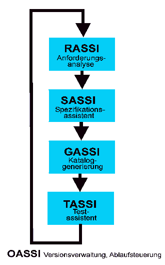Aus dieser Spezifikation werden durch GASSI (generation assistant) dann elektronische Kataloge in JAVA automatisch generiert, die durch TASSI (testing assistant) systematisch auf Konsistenz und Vollständigkeit getestet und abschließend unter Moderation von RASSI dem Auftraggeber vorgestellt werden können.